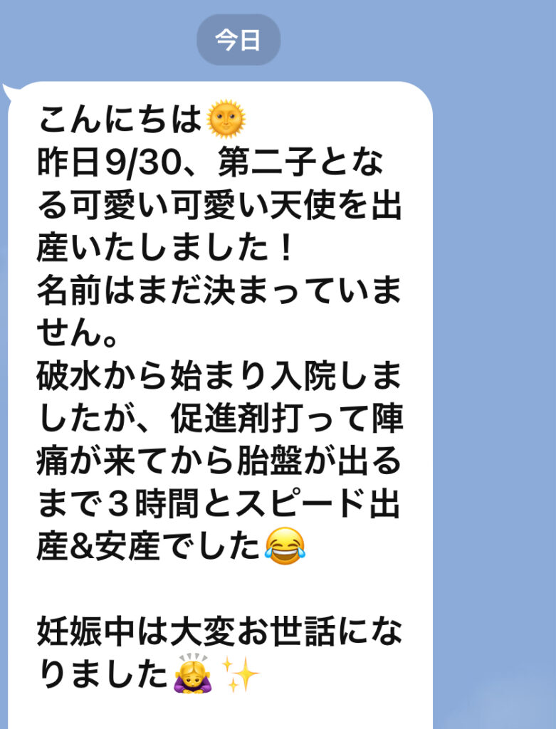 ご出産おめでとうございます!第二子となるお子さんを無事に出産です。妊娠中は数回鍼灸整体施術でサポートさせていただきました。ご自身の体力の回復を優先にお過ごしください。