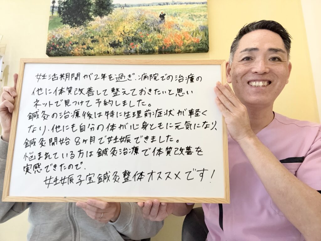 妊活期間が2年を過ぎ、病院での治療の他に体質改善して整えておきたいと思いネットで見つけて予約しました。 鍼灸の治療後は特に生理前症状が軽くなり、他にも自分の体が心身共に元気になり、鍼灸開始8ヵ月で妊娠できました。 悩まれている方は鍼灸治療で体質改善を実感できたので、 妊娠子宝鍼灸整体オススメです!