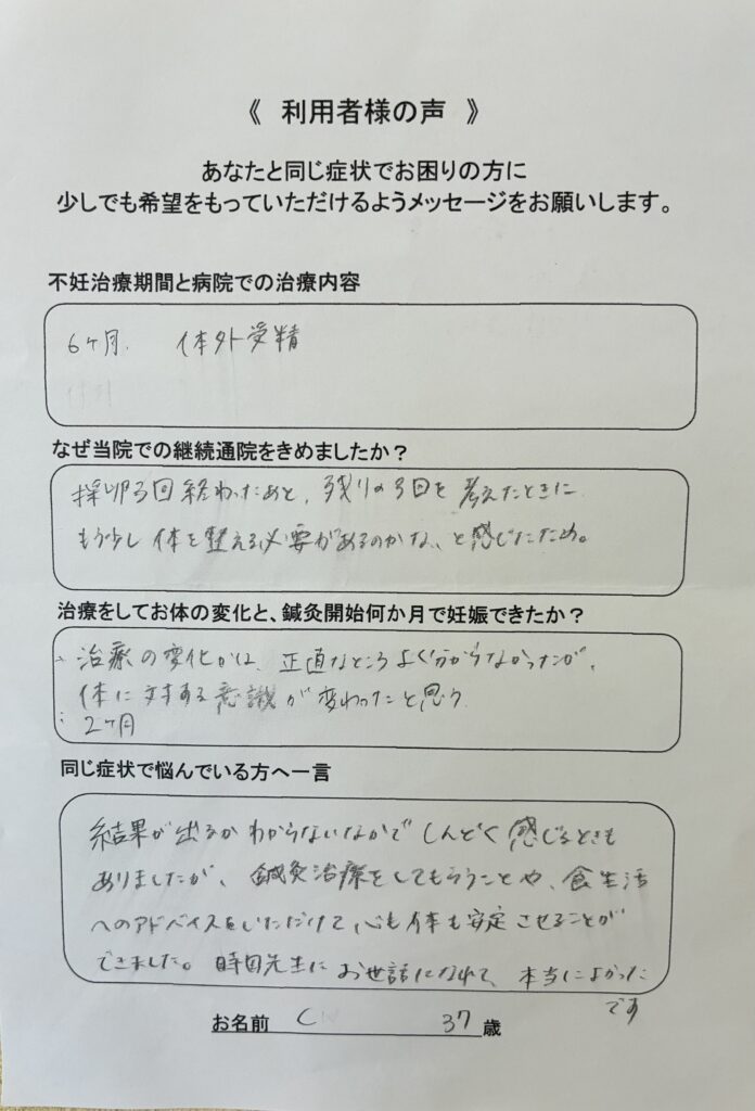 結果がでるかわからないなかでしんどく感じるときもありましたが、鍼灸治療ををしてもらうことや。食生活へのアドバイスをいただいて心も体も安定させることができました。